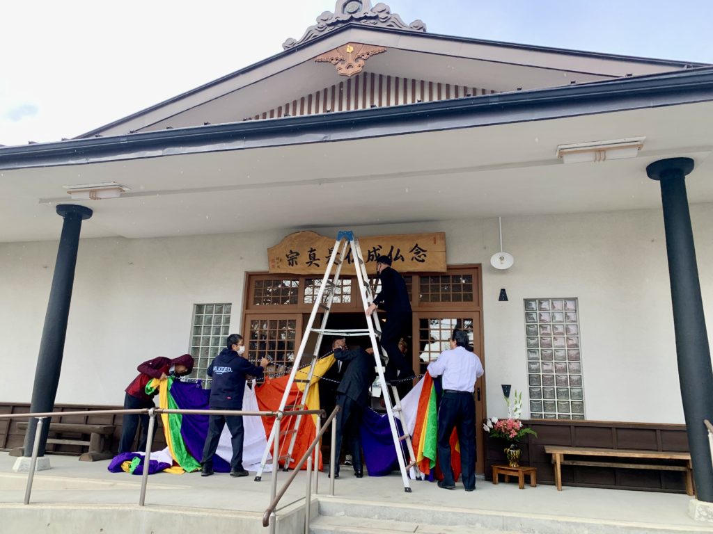 17日は午前中からご門徒さんにご協力いただき、幕をかけたり提灯を出したりとお迎えをする準備。