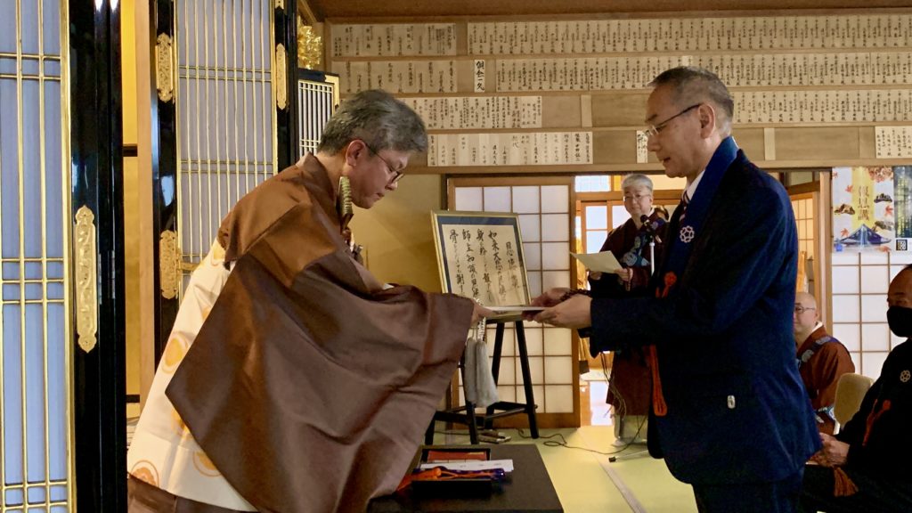 17日の大逮夜(午後のお勤め)では、勤行に先立ち、来年に迎える「大昭寺開教90年」のお待ちうけ行事として、
