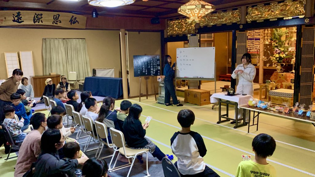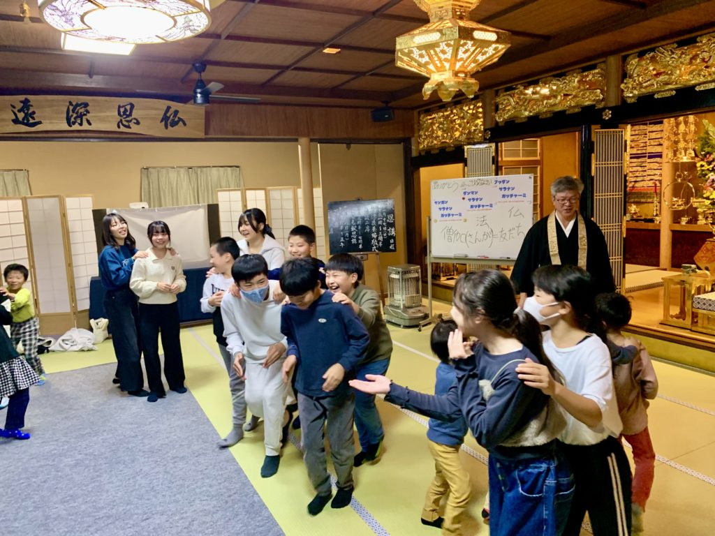 みんなで一緒にお勤めをして、住職の話を聞いた後はレクリエーションの時間!
