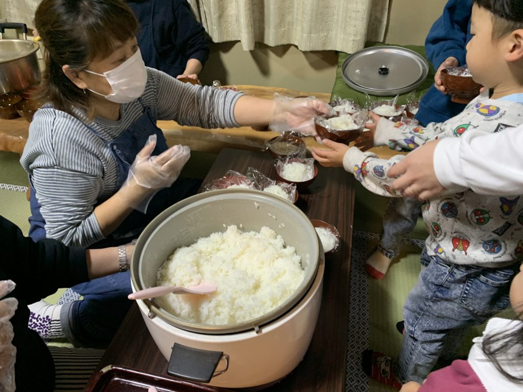 夜ご飯は、みんなでおにぎりを握って、お味噌汁と一緒にいただきました!