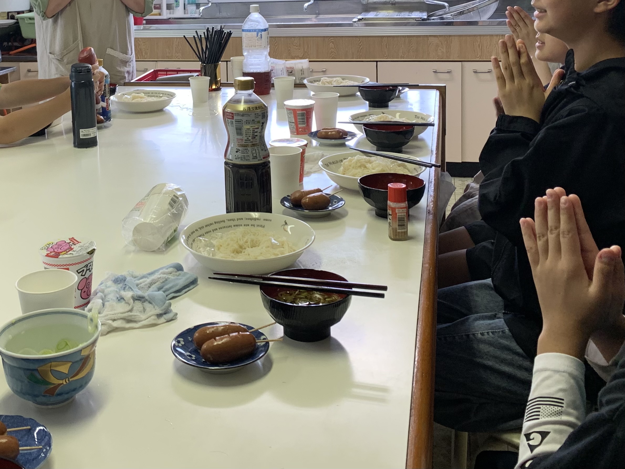 朝市終了後、昼食はお寺の厨房で夏らしい、そうめんを食べました。