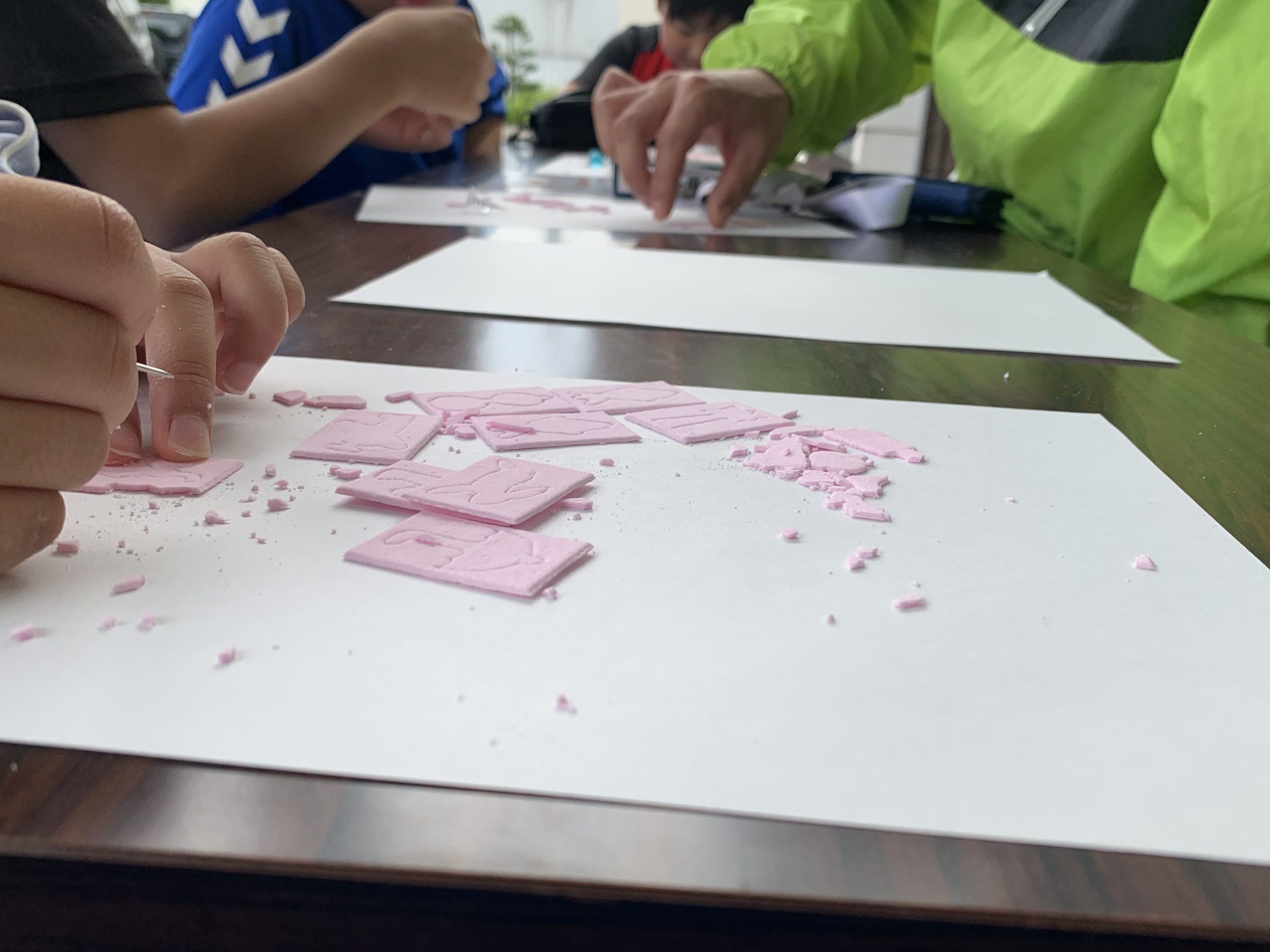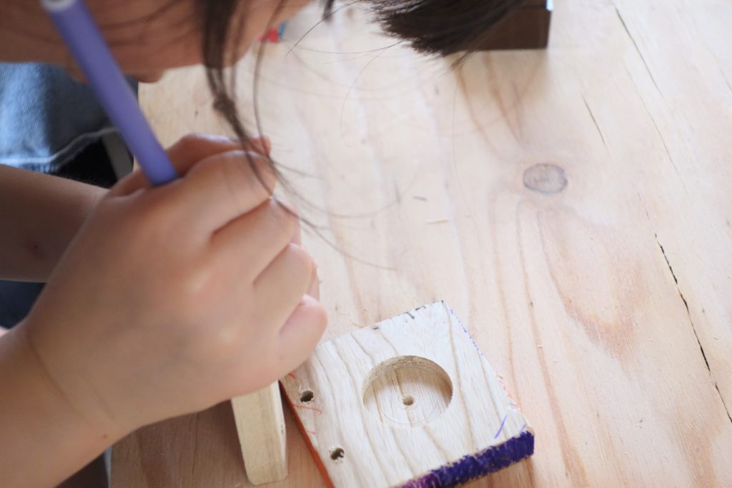 木に好きな色を塗って、トンカチで叩いて…。みんな一生懸命です。